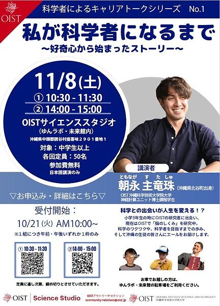 The first session in the Career Talk Series by Scientists will feature Sutashu Tomonaga, a 5th-year PhD student at OIST from Okinawa, who will share his journey of becoming a scientist.