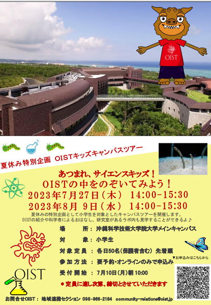 As a special summer vacation event, we will hold a campus tour for elementary school students. You can join us for an introduction to OIST, a lecture by a scientist, and a tour of laboratories.(※Japanese only)