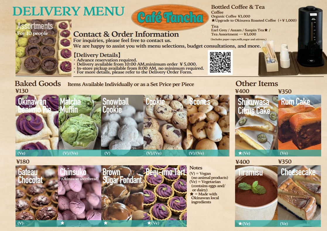For food orders, please place your order at least one week before the delivery date. For any changes or cancellations, please contact Café at least three business days before the delivery date. Regarding drinks, please place your order at least two business days before the delivery date. For changes or cancellations, please contact Café by 12:00 PM on the day before the delivery date. For Café Tancha Drink Delivery, the minimum order for drink pots is two. Menu updated on April 14th 2025.