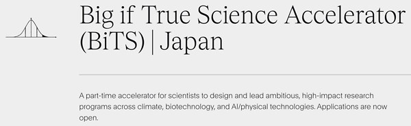 The Japan Government's Global Startup Campus Initiative was launched to attract world-class researchers, startups, and investors to pilot ambitious programs in international research, venture building, and fellowships. As part of this initiative, U.S.-based Renaissance Philanthropy has been selected by the Japanese Government to deploy their Big If True Science (BiTS) Accelerator Program in Japan to train Venture Directors, science leaders capable of designing and implementing ambitious R&D programs focused on climate, biotechnology, and AI/physical technologies, and training a pipeline of next-generation science leaders through fellowship programs.