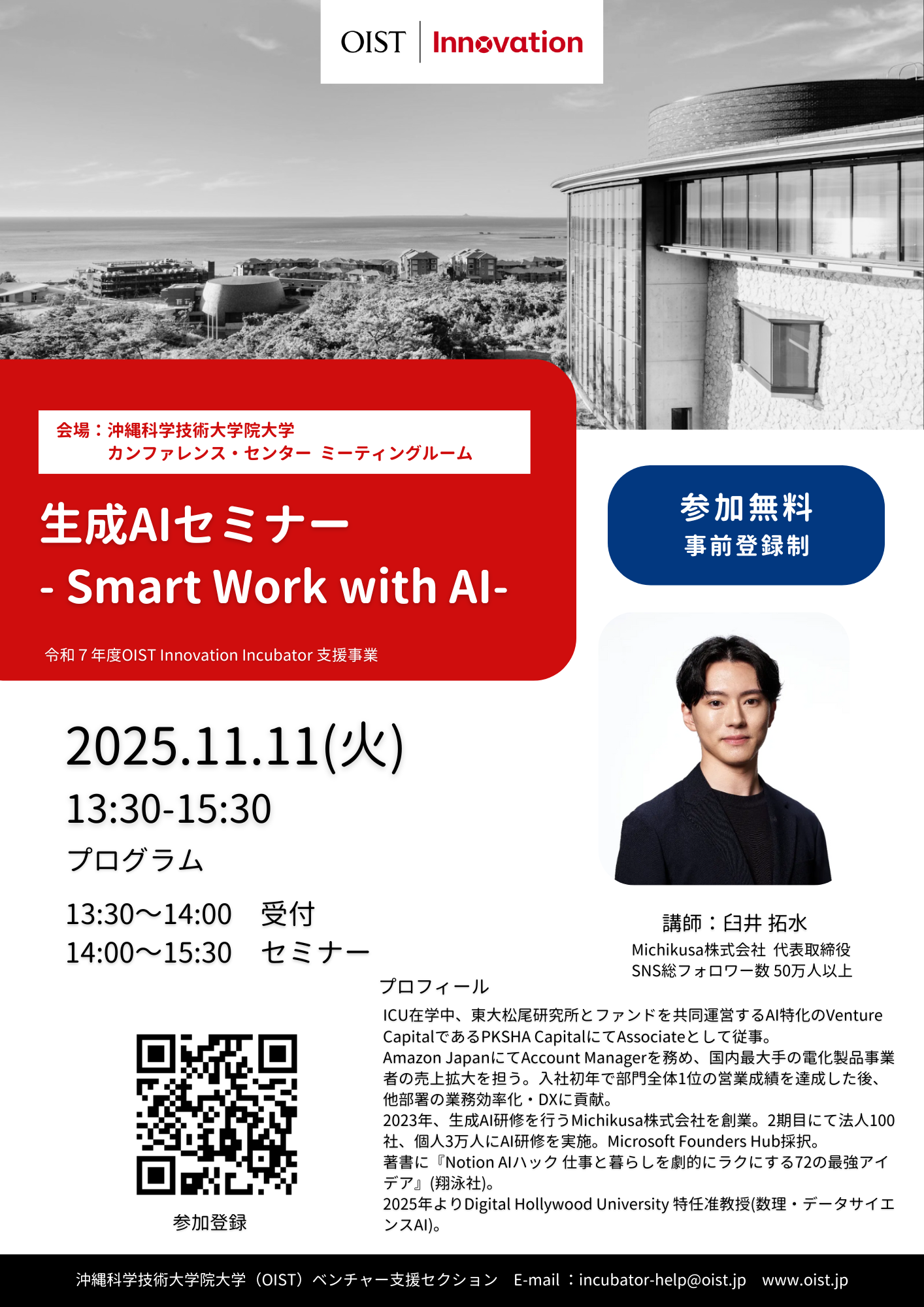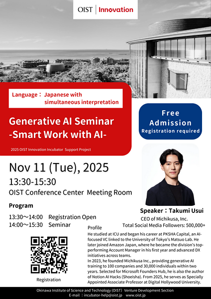 OIST Innovation will host a seminar on “Smart Work with Generative AI” as follows.