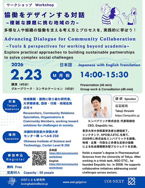 このワークショップでは、講演、グループディスカッション、質疑応答の時間が含まれます。社会問題の解決や地域連携に取り組んでいる研究者や地域の方々にとって、様々な視点や実践的な戦略を学ぶ機会になると思います。
