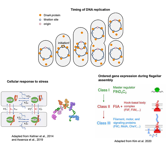 Bacteria operate at molecular scales where thermal fluctuations are significant. Consequently, they deploy a wide range of regulatory strategies, either to reduce the effects of noise or, when possible, to exploit it to their own advantage. This course introduces a selection of such strategies, describing the theoretical methods and experimental techniques used to study them. The course is organized into four independent parts. The first part will be devoted to quantitative models of molecular control, including allostery, kinetic proofreading, enzyme kinetics and the statistical physics of ligand binding. We will then examine how bacteria manage to coordinate their cycle of DNA replication with the growth cycle in different conditions. The third part focuses on regulatory mechanisms that govern the response to thermal stress (both heat shock and cold shock). Finally, we will explore gene-regulatory processes in bacterial flagellar systems. The course is presented as 4 weeks of 2 hour classes. There are no formal prerequisites, although basic knowledge of cell biology and statistical physics may be useful.