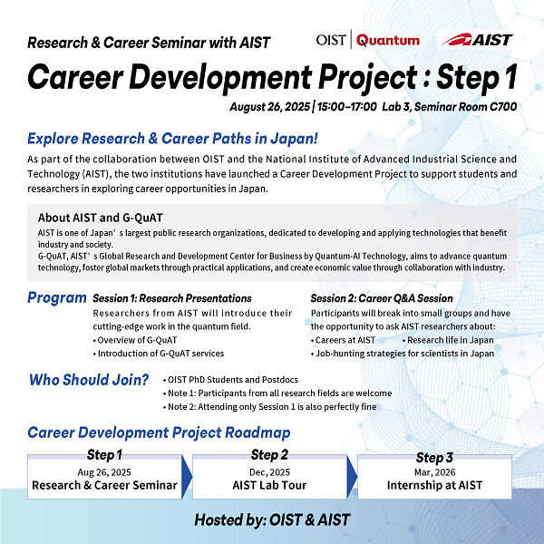 As part of the collaboration between OIST and the National Institute of Advanced Industrial Science and Technology (AIST), the two institutions have launched a Career Development Project to support students and researchers in exploring career opportunities in Japan.